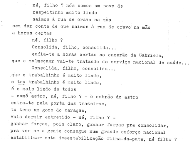 País: ditadura, revolução, esvaziamento da promessa democrática, histórias de família. Depois: procura criar-se uma genealogia íntima onde a escuta parece querer tornar-se estratégia de resistência, mas acho que não há escuta, apenas uma forma. Ouvir: a revolução como fetiche simbólico, evocada como nostalgia ou usada como slogan. A forma: prometer que se vai chorar e não chorar não é justo; precisamos de chorar em conjunto, muito. Chorar as derrotas e os sonhos desfeitos, esgotar as possibilidades de história até não sobrar nada, abandonar as referências aos passados. Tarefa impossível, talvez, e por isso mesmo é que a tentamos. O possível já foi feito e não foi suficiente. Mas que isto não seja lido de um ponto de vista derrotista, porque isso implicaria que haveria outro, e não há. Basta olhar à volta e também olhar para dentro. Na verdade, são reflexos um do outro.